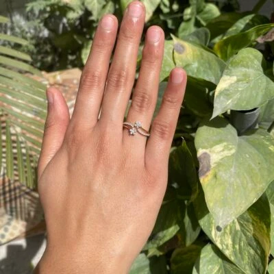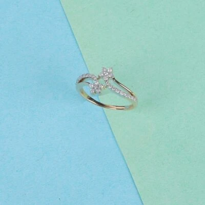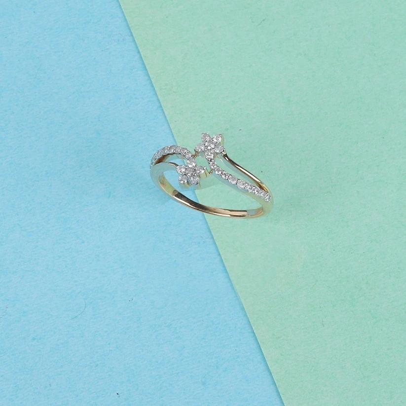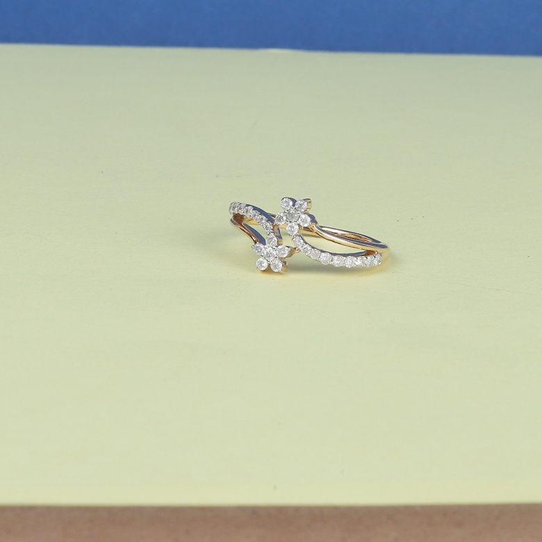 This dual flower diamond ring is made in 14 karat yellow gold with 0.33 carat certified diamonds.