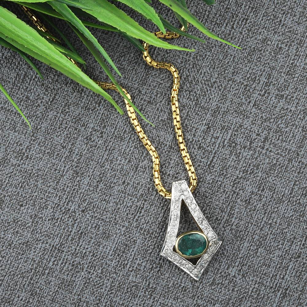 Diamond pendant with emerald in center, is made with 25 diamonds in 14 karat gold.