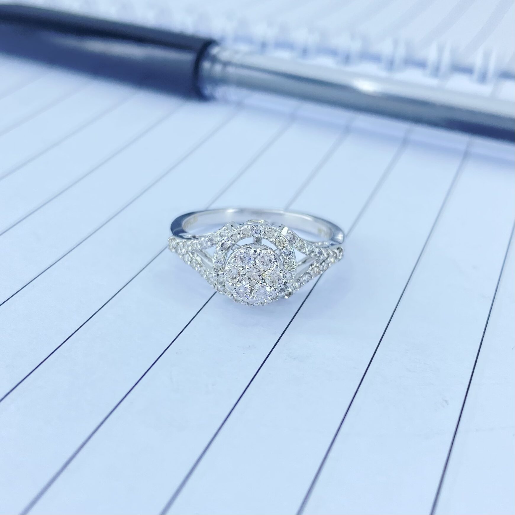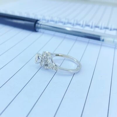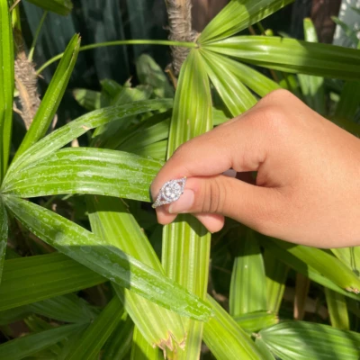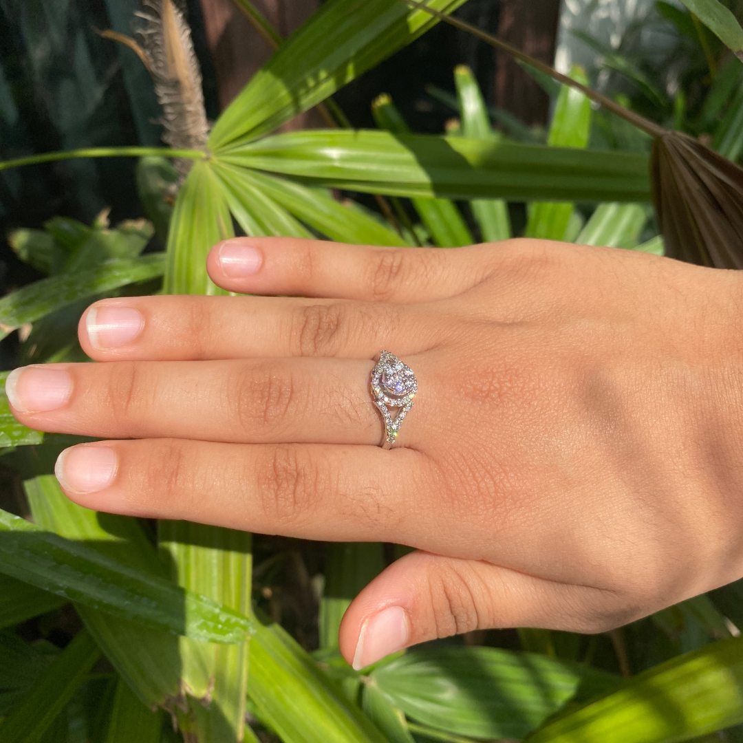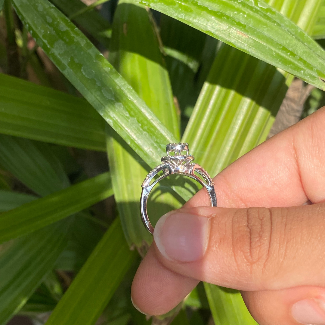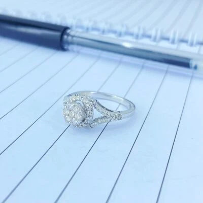 Jiya cluster diamond ring is made in 14 karat white gold with diamonds in the center are set in such a way that it looks like a single diamond piece.