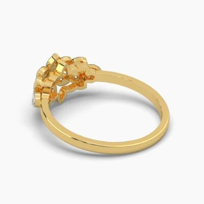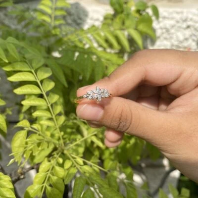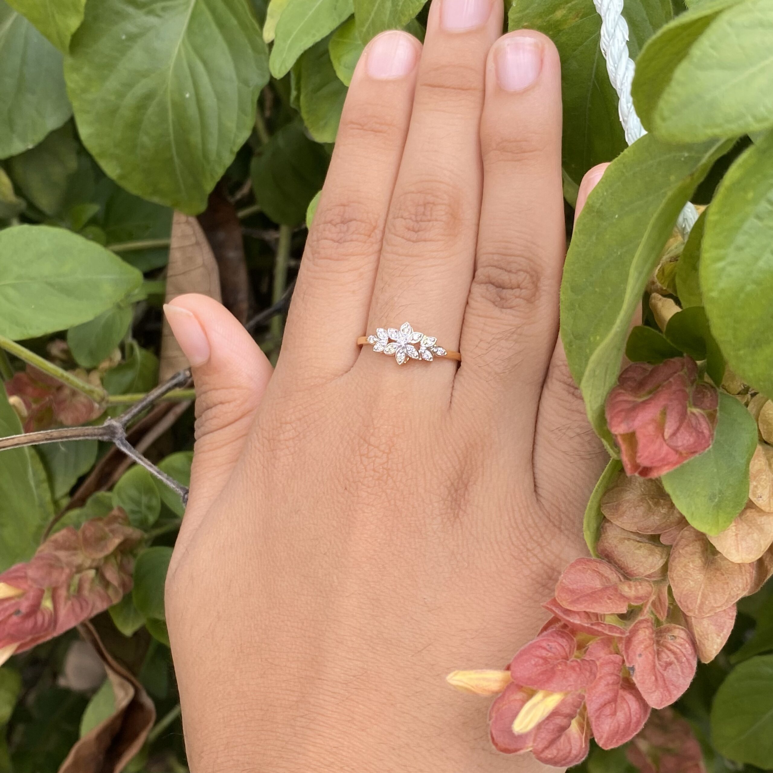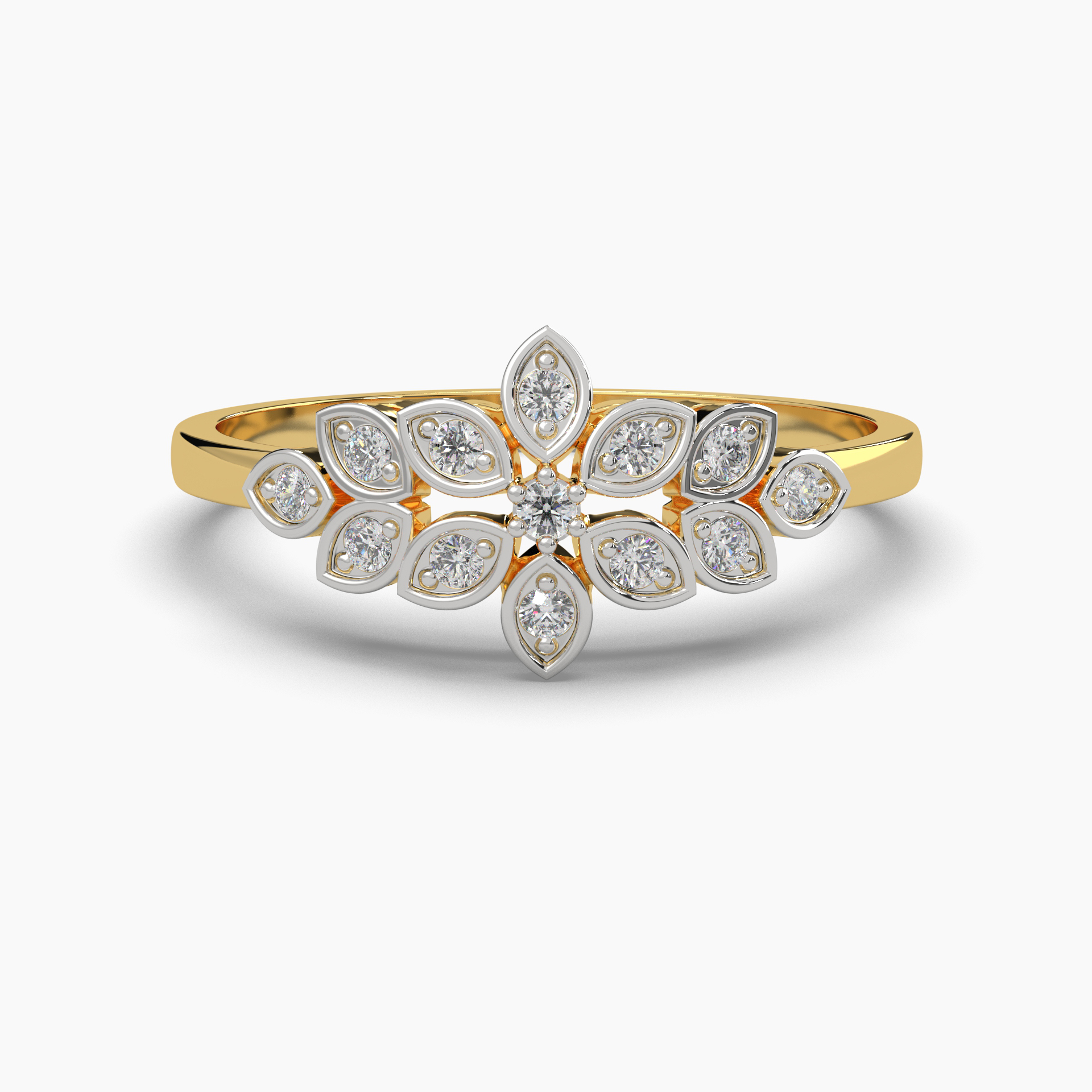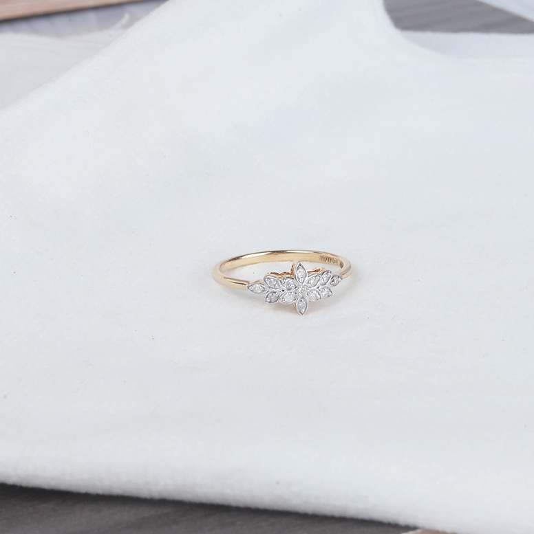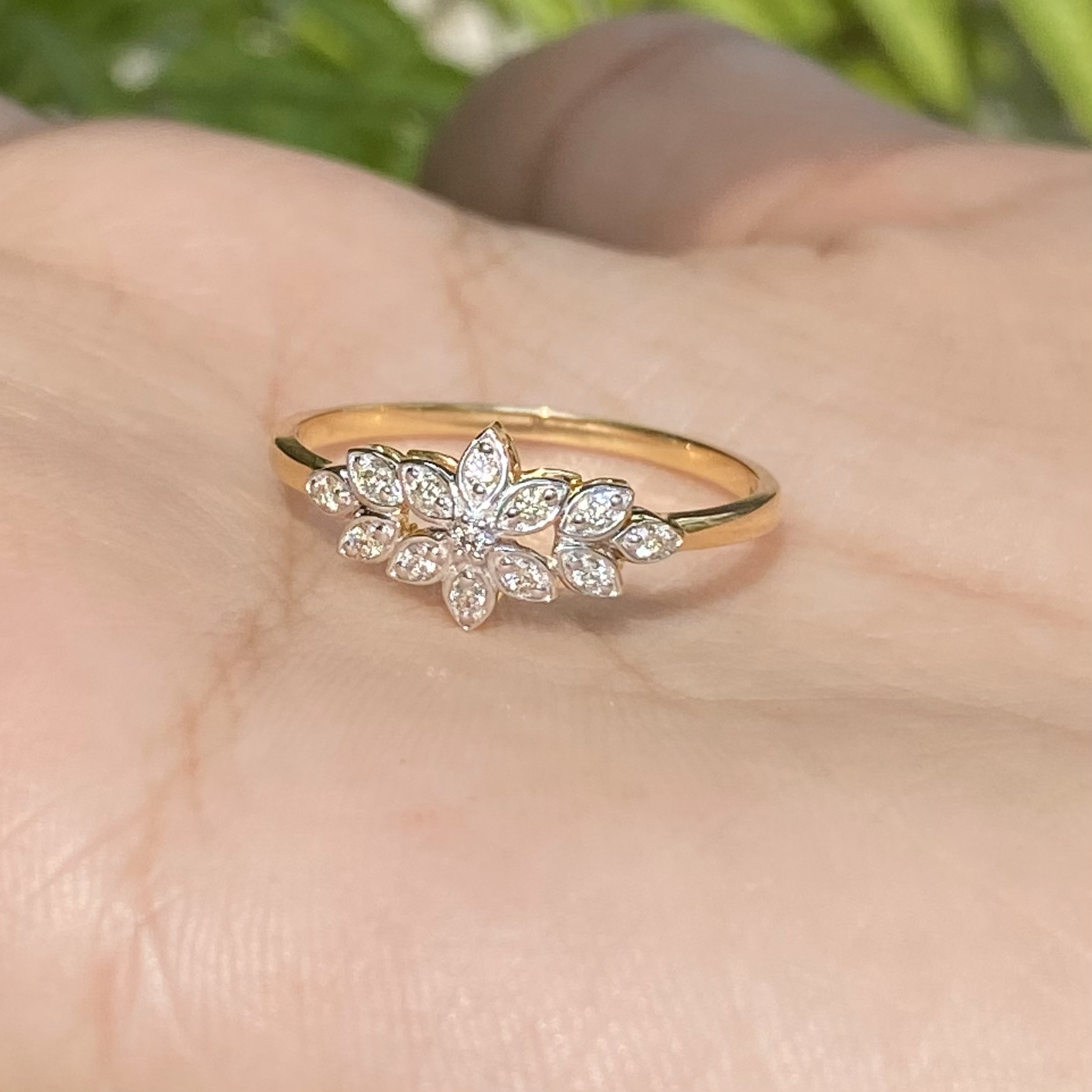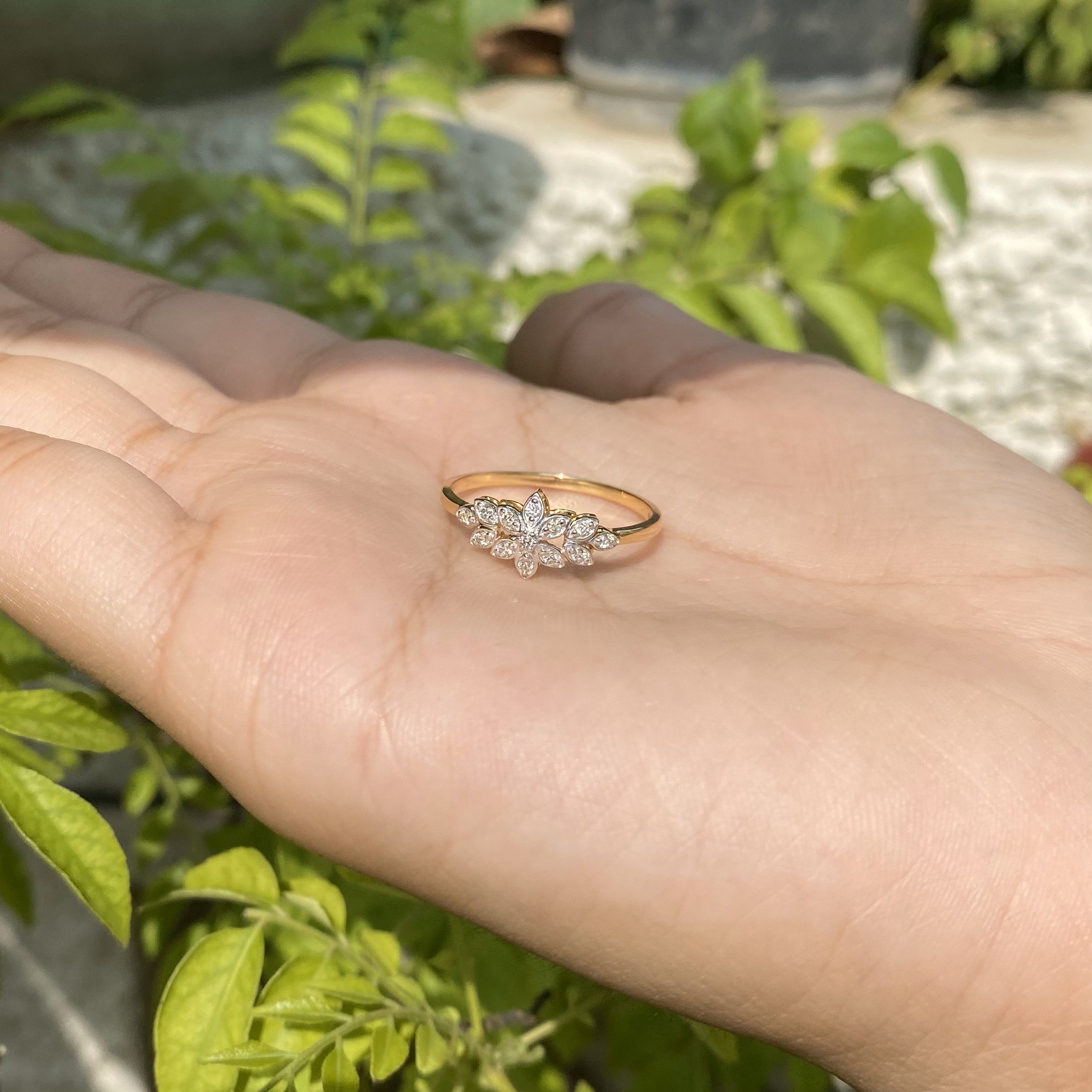 Light weight diamond ring with 13 diamond set in shape of flower.