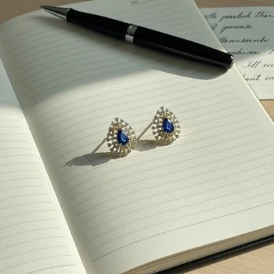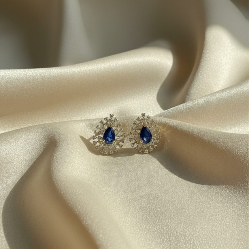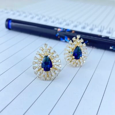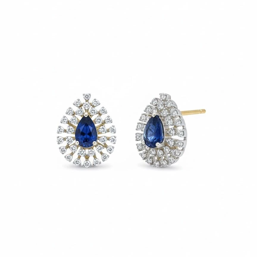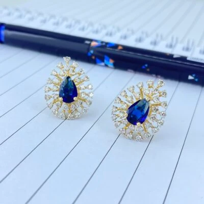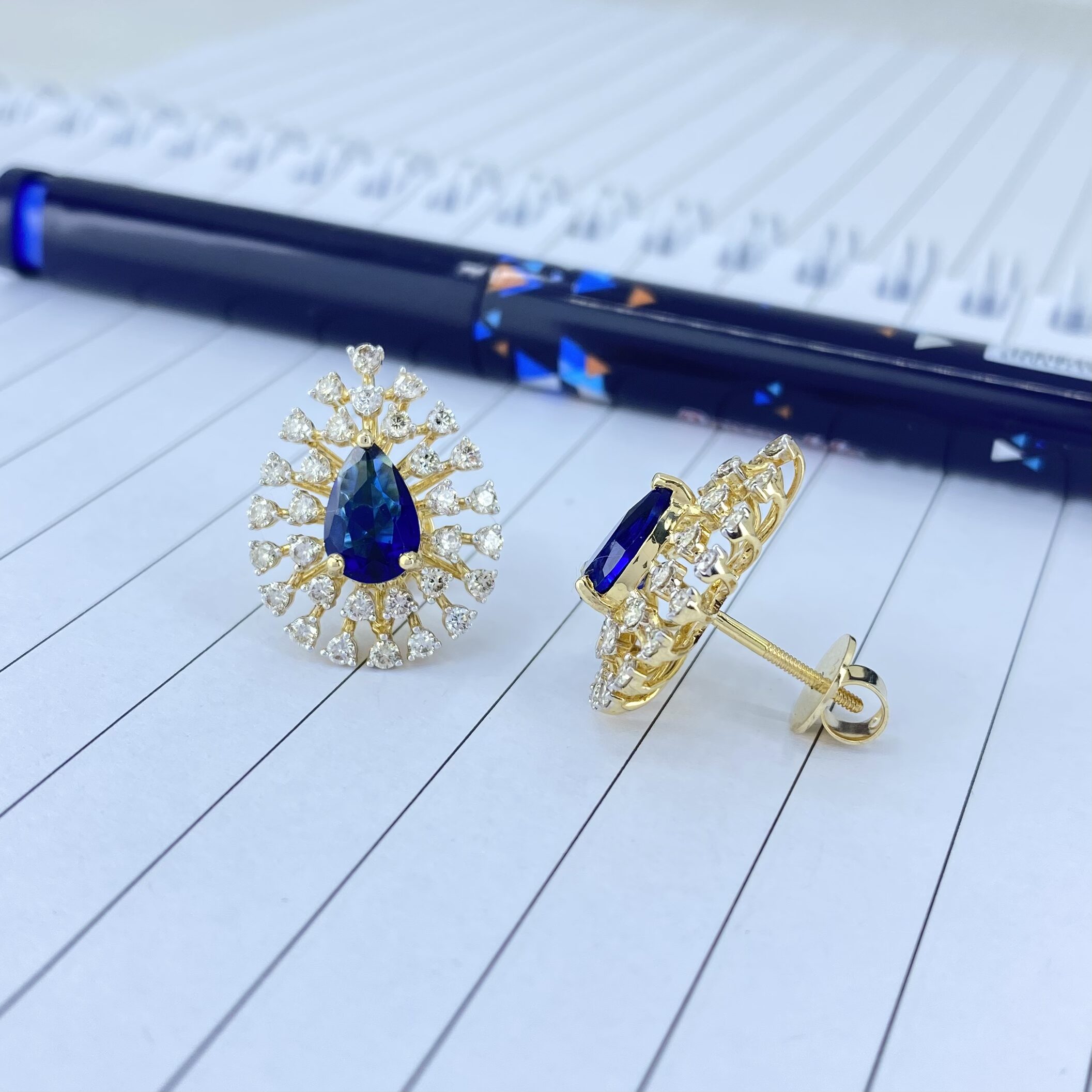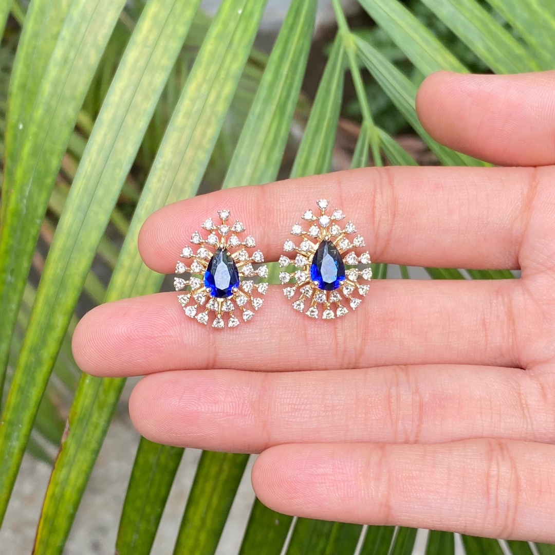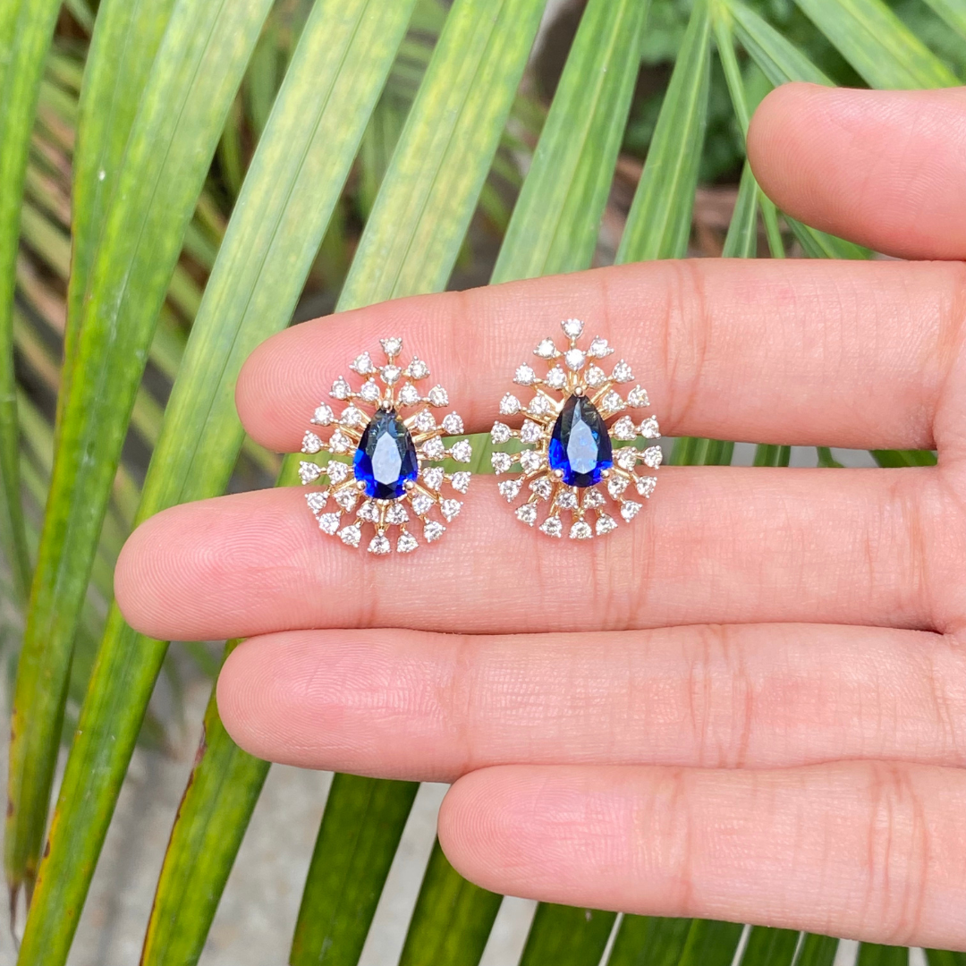 These Queen Diamond Earrings are made in 14kt yellow gold with 62 natural diamonds and 2 synthetic blue colour stone.