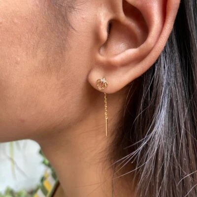 Trio diamond Sui Dhaga earrings feature a chic design with six dazzling diamonds arranged in sets of three. Their delicate yet impactful style elevates any look, adding a touch of sparkle to both casual and formal attire. A versatile choice for those who appreciate modern elegance in their accessories.